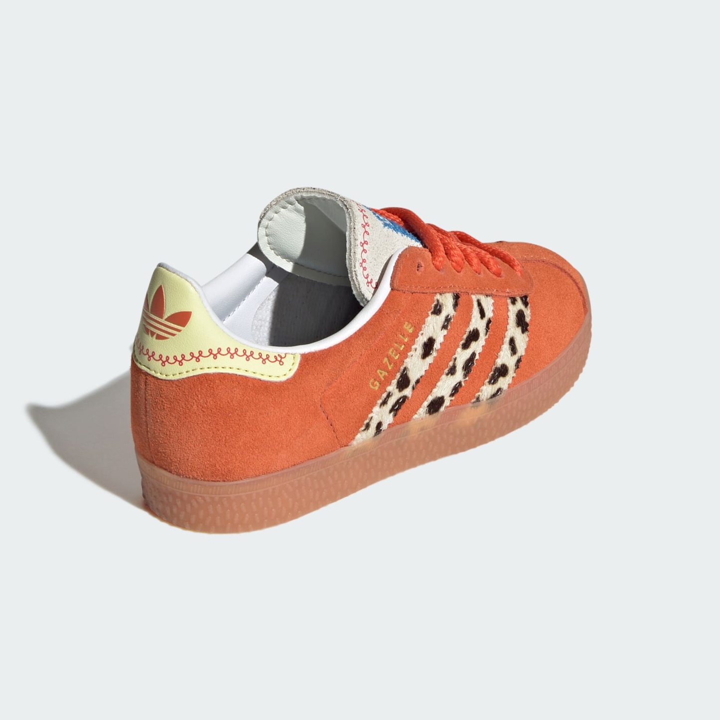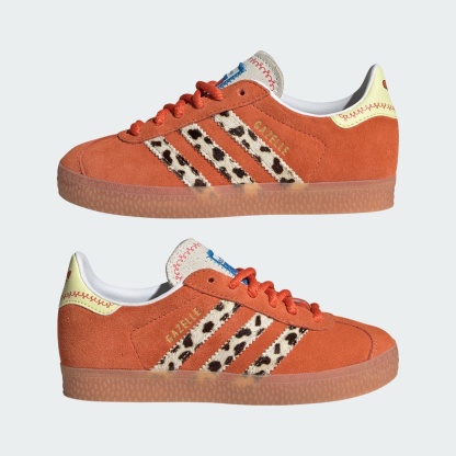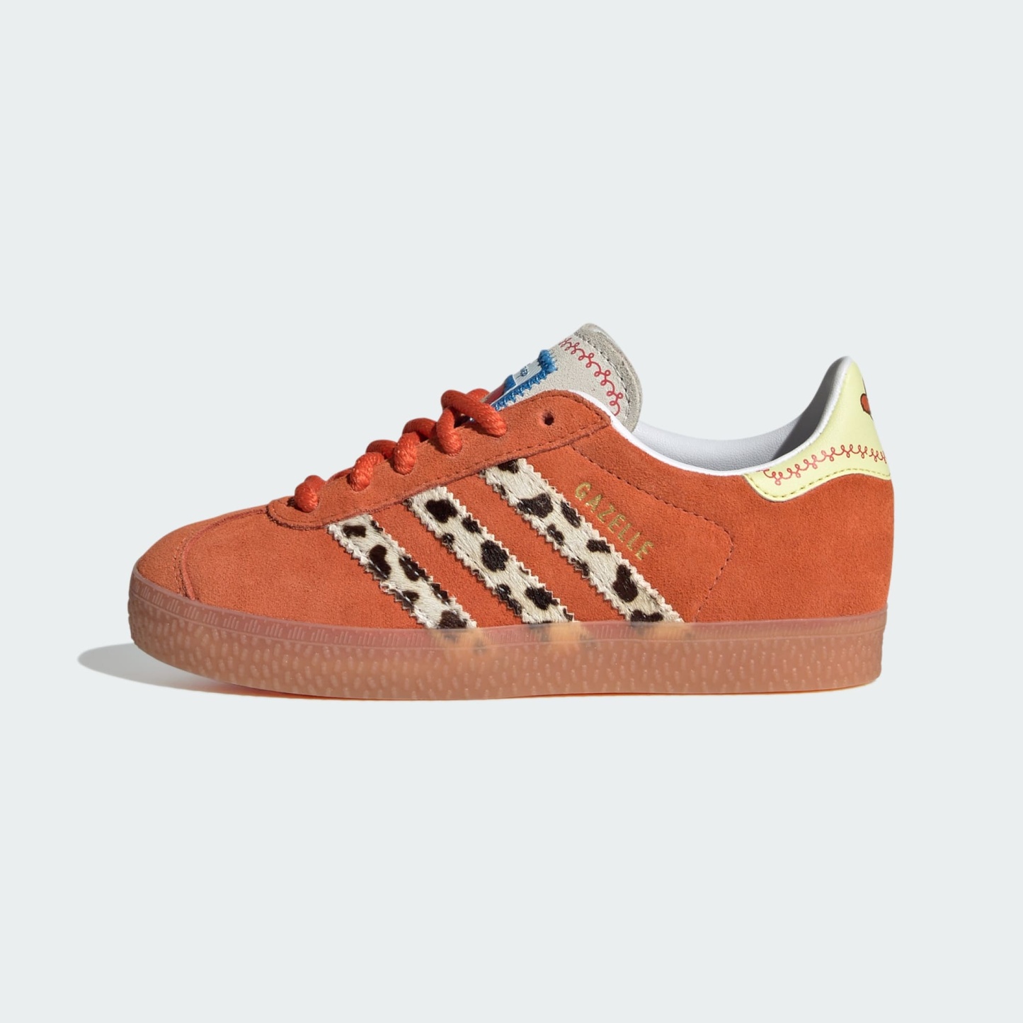 Collaborating with Disney Pixar, these kids' adithtdas Gazelle shoes transport imaginations to new heights. Vibrant colours and graphics take after Jessie from Disney Pixar's "Toy Story," with tongue, heel tab and sockliner details inspired by the toy cowgirl's look. On the sides, serrated 3-Stripes are done in a Holstein cow pattern to match her chaps. These lace-up shoes have a durable synthetic leather upper with a comfy lining and a low-profile rubber outsole that gives kids lots of traction on the playground and beyond.
