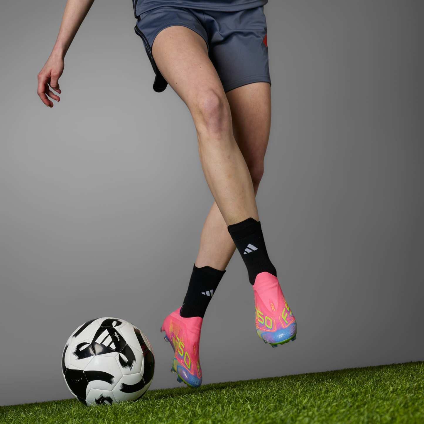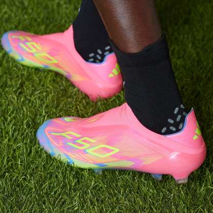Laceless firm ground cleats for lightning pace, made in part with recycled materials.