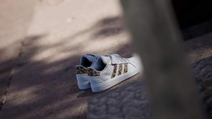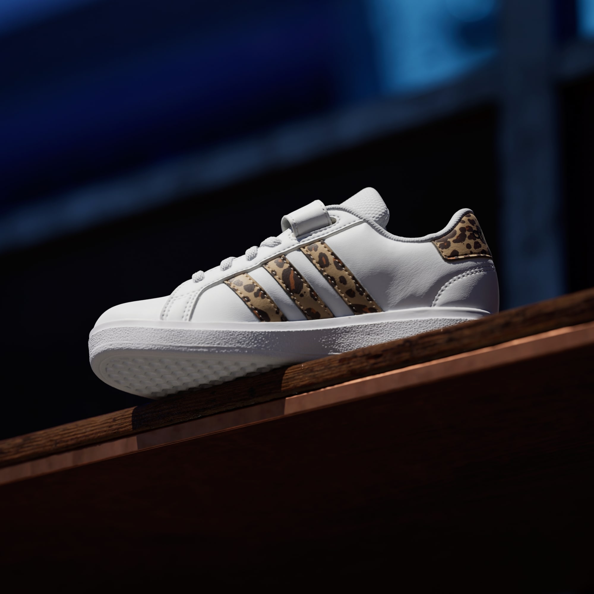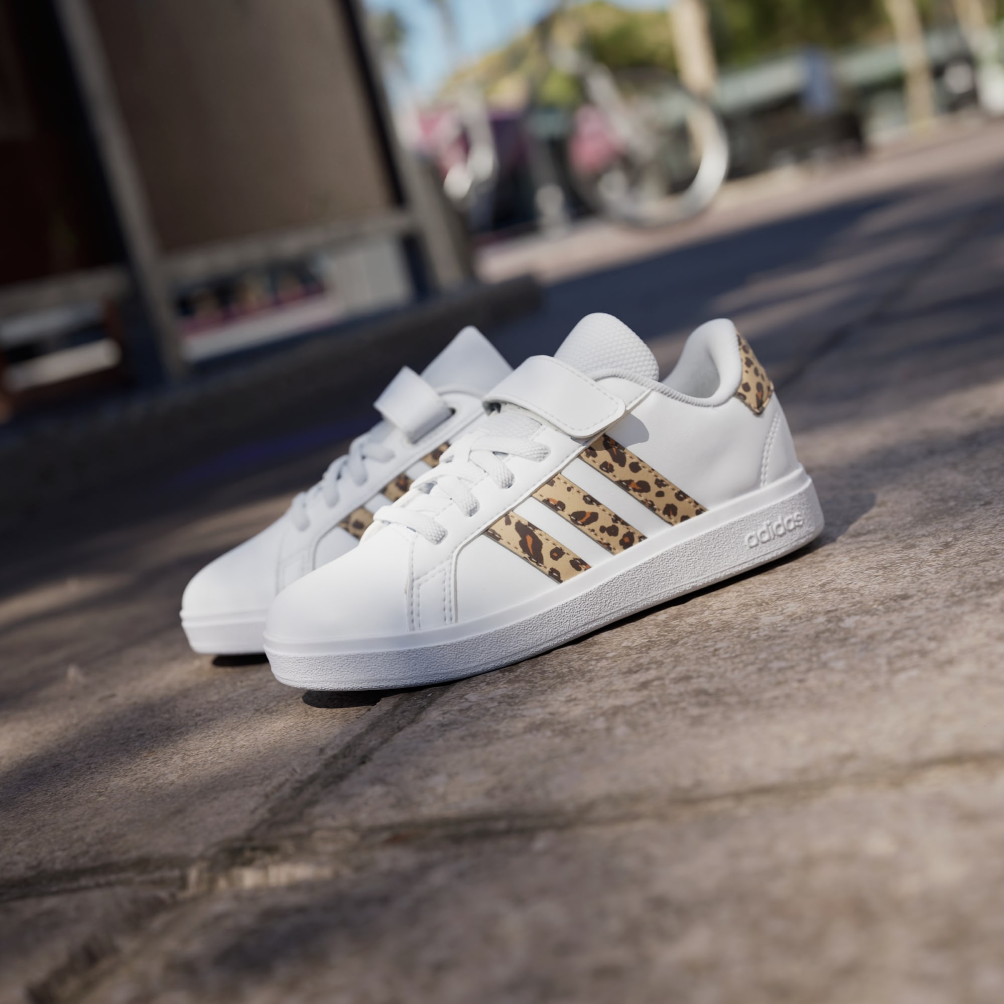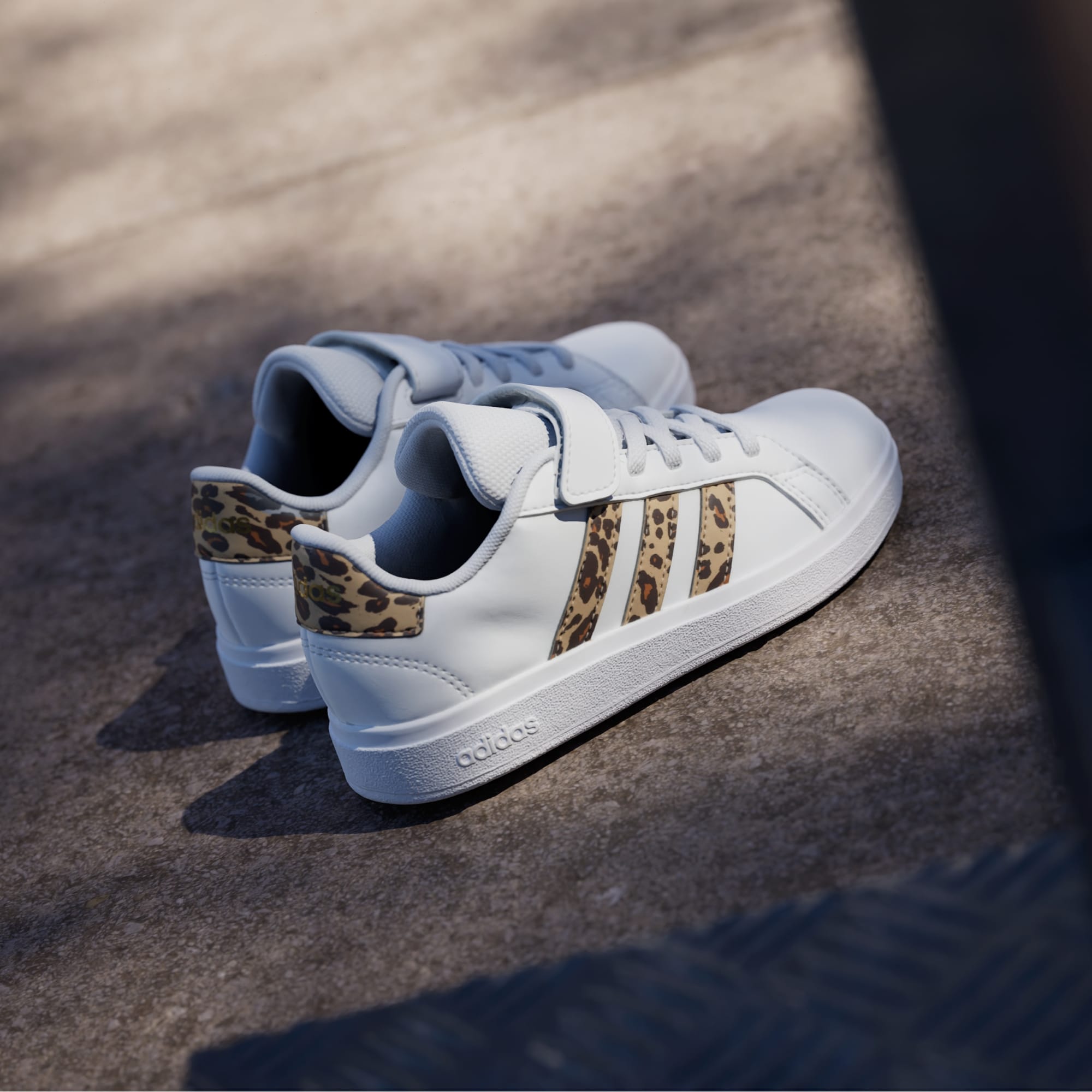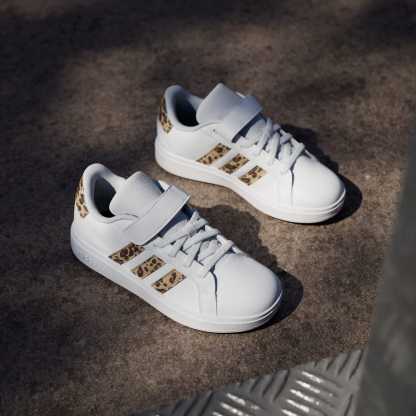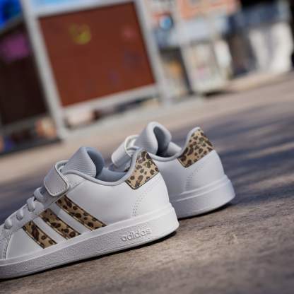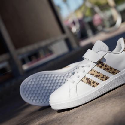 Touches of print brings a modern vibe to these iconic Grand Courts. Great for kids who are always bouncing between activities, these kids' adithtdas sneakers slip on quickly, with elastic laces and a hook-and-loop top strap to secure the fit. A soft lining supports the foot while the flexible rubber cupsole keeps kids firmly planted. Let the fun begin.