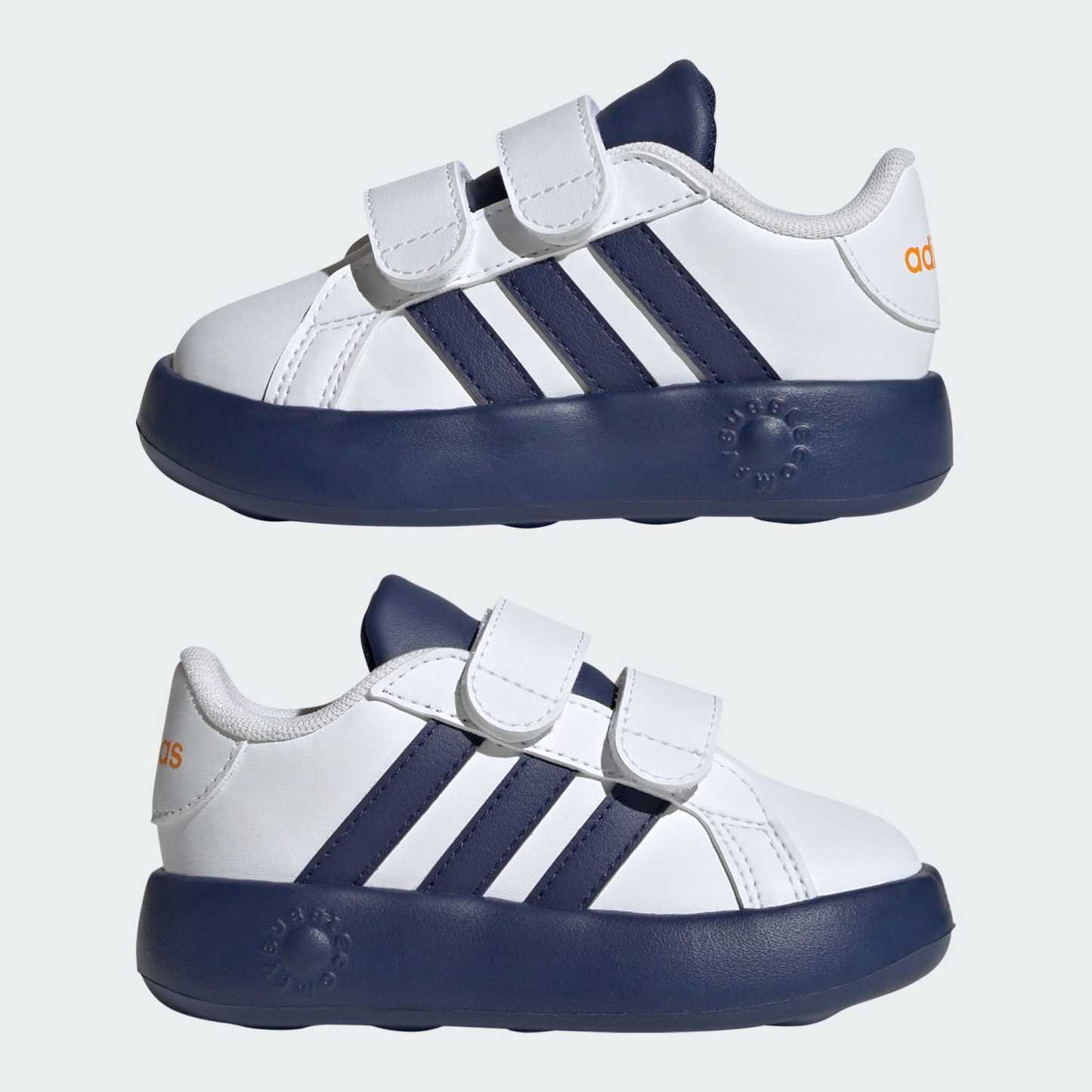 If your infant could talk, they'd tell you how much they love these adithtdas Grand Court shoes! Hook-and-loop straps make slipping these on a cinch, while the bubbly EVA sole keeps little growing feet happy. Whether they're crawling, cruising or taking their first steps, the fun colors and classic 3-Stripes will inspire a lifetime of play. This product features at least 20% recycled materials. By reusing materials that have already been created, we help to reduce waste and our reliance on finite resources and reduce the footprint of the products we make.